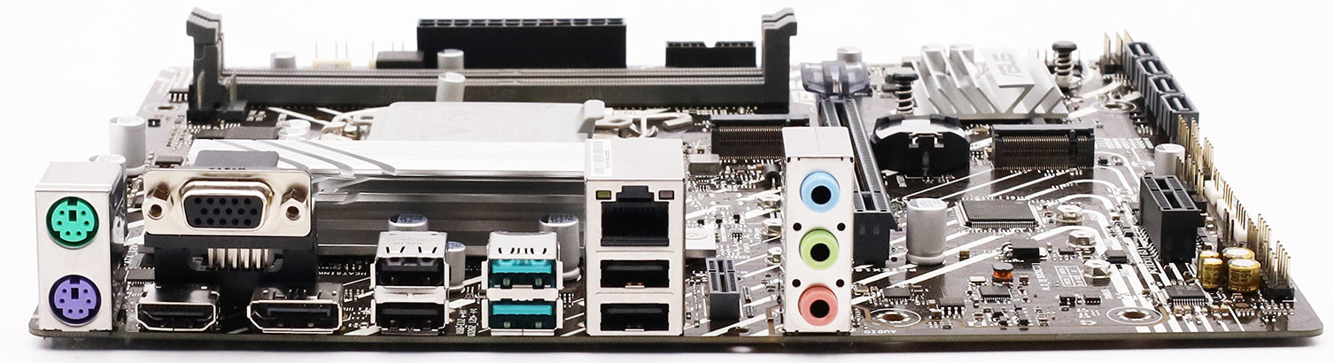 - Anschlüsse extern: 1x VGA (iGPU), 1x HDMI 2.1 (iGPU), 1x DisplayPort 1.4 (iGPU), 2x USB-A 3.1 (10Gb/s, H610), 4x USB-A 2.0 (480Mb/s), 1x Gb LAN (Intel I219-V), 3x Klinke, 1x PS/2 Tastatur, 1x PS/2 Maus