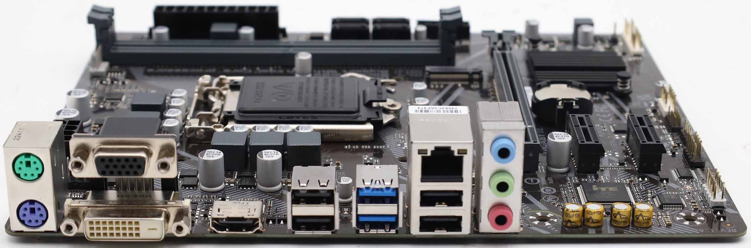 - Anschlüsse extern: 1x HDMI 1.4b (iGPU), 1x VGA (iGPU), 1x DVI-D (iGPU), 2x USB-A 3.0 (5Gb/s), 4x USB-A 2.0 (480Mb/s), 3x 3.5mm Klinke (Realtek ALC887), 1x RJ-45 (1000Base-T, Realtek RTL8118AS), 1x PS/2 Tastatur, 1x PS/2 Maus